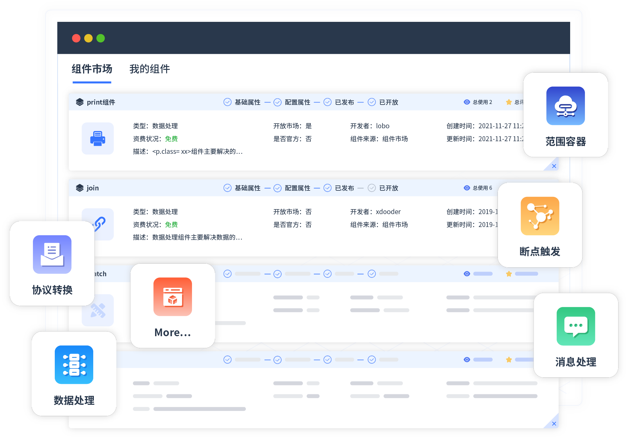 针对集成场景,蓝狮在线提供组件市场,例如协议转换、消息处理、文件操作等。除平台提供的组件外,客户可以自定义所需组件。